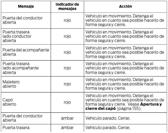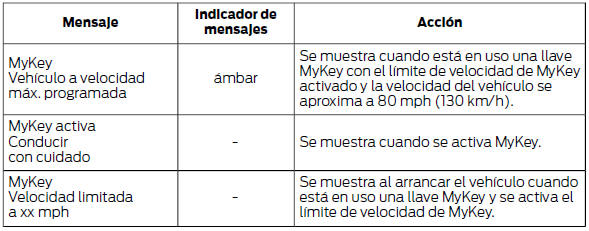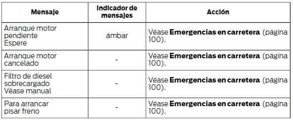 Nota: En función de las opciones del vehículo, se mostrarán o estarán disponibles solo algunos mensajes. Algunos mensajes pueden aparecer abreviados o con una longitud más reducida en función del tipo de cuadro de instrumentos que tenga su vehículo.