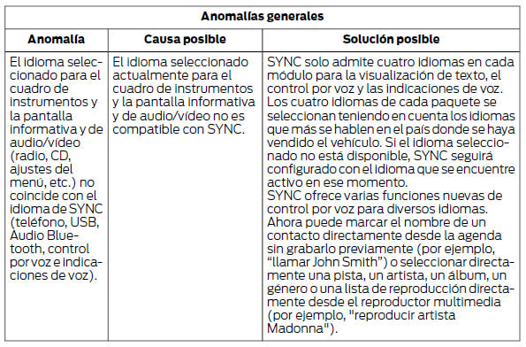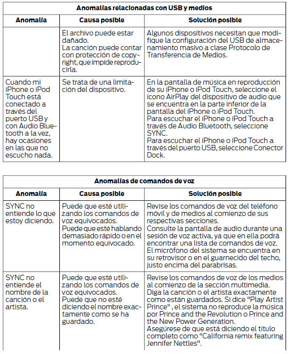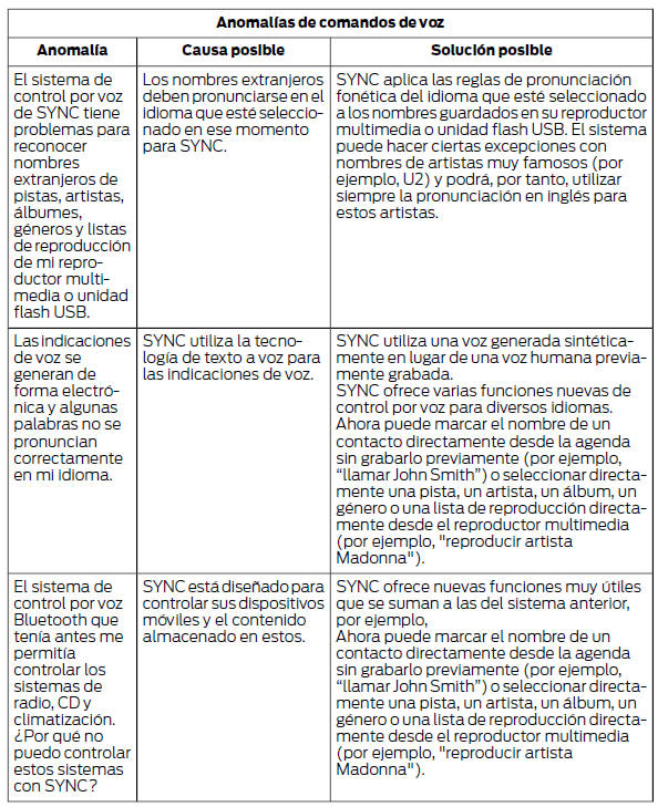 Su sistema SYNC es fácil de usar. No obstante, en caso de surgir dudas, consulte las tablas de más abajo.
